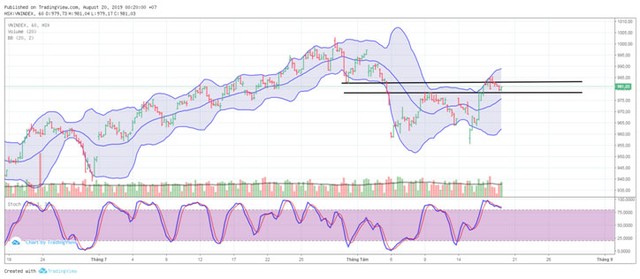 Ở khung thời gian này, dễ thấy áp lực chốt lời mạnh đã khiến VN-Index đang có xu hướng quay lại kiểm tra đỉnh gần nhất tầm 978-979 điểm, may mà cây nến cuối phiên đã bật lại hướng về ngưỡng cản 983-984dường như hàm ý thị trường vẫn chưa muốn chấm dứt nhịp hồi phục, chỉ báo Stochastic đang có xu hướng quay lại cắt xuống ngưỡng 80 rõ ràng là thiếu tích cực. Tuy nhiên, nếu phiên 20/8, khu vực 978-979 không thủng thì nhiều khả năng nhịp tăng sẽ vẫn được duy trì.