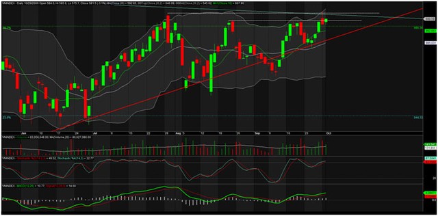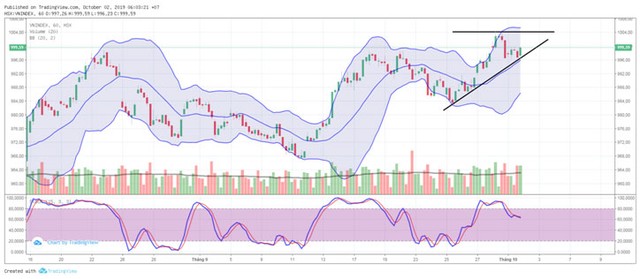 Mặc dù tăng không nhiều nhưng trên đồ thị VN-Index vẫn vượt qua đỉnh 998,67 của tháng 8 và áp cực sát ngưỡng 1.000 điểm với khối lượng duy trì tốt. Tuy chưa thể vượt, nhưng cũng phần nào làm suy giảm các dấu hiệu tiêu cực của cây nến hôm 30/9.