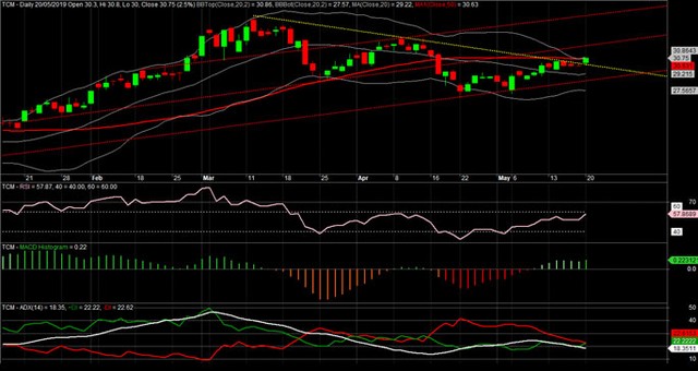 Đường DMI+ sắp cross đường DMI- và RSI sắp cán mốc 60 cho kỳ vọng giá sẽ phát triển tốt trong ngắn hạn. Giải BB đang có xu hướng thắt lại thì sau phiên 20/5 đã mở ra. Tóm lại, nhà đầu tư có thể mua được TCM (sẽ giảm tỷ trọng khi giá quay lại kênh giảm và cắt lỗ khi giá dưới MA20 (29,2)).