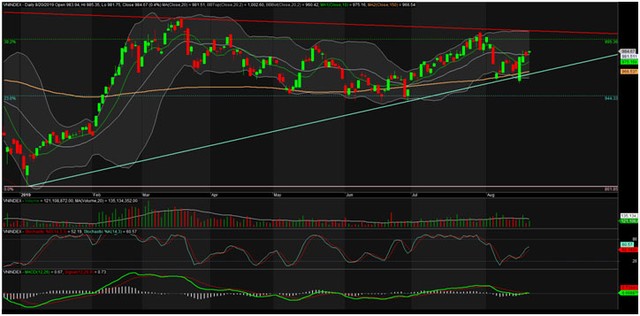 Quan sát trên đồ thị cho thấy, phiên 20/8, VN-Index đã vượt qua đường MA20 khá đơn giản. Tuy không nhiều nhưng vẫn đủ để tạo ra 1 tín hiệu giao cắt tích cực ở thời điểm hiện tại. Khó khăn của chỉ số dường như vẫn là khu vực 985-986, nơi mà bên bán đang kiểm soát hoàn toàn trong 2 phiên gần đây nhất. Nếu ngày 21/8, VN-Index có thể vượt qua khu vực này thì đương nhiên xu hướng tăng sẽ được định hình rõ nét hơn.
