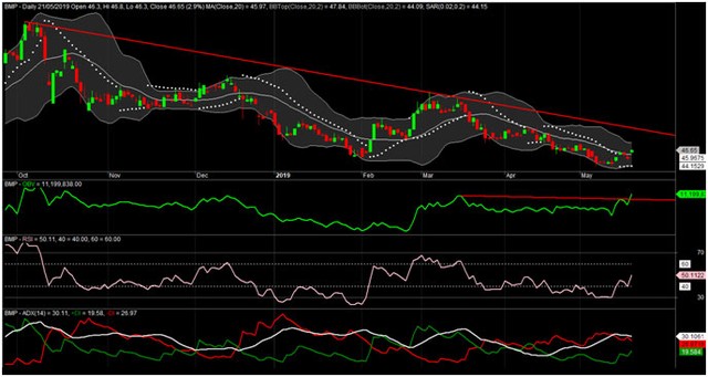 Có thể kỳ vọng BMP đang hướng tới mục tiêu 50, tương đương chạm kênh giá xuống như trên đồ thị. Giá hồi phục từ đáy gần nhất (44) mới chỉ 6%. Hầu hết các chỉ báo nhìn đều khá đẹp. Giá đã vượt qua MA20. Duy chỉ có DMI+ chưa cắt lên DMI-, nhưng khối lượng giao dịch phiên 21/5 đột biến gần gấp 3 trung bình 20 phiên. OBV đã có phiên break khỏi kênh như trên đồ thị.