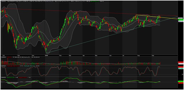Thị trường mất điểm khá trong phiên cuối tuần, để lại chút lo lắng cho nhà đầu tư khi VN-Index kết phiên thấp nhất ngày xác định một mẫu hình nến xấu. Nguy hiểm hơn, giá lại quay lại trendline xuống khiến rủi ro tăng lên đáng kể. Hơn nữa, VN-Index cũng đang có xu hướng quay lại kiểm tra đường MA10 tầm 984-985 điểm làm nguy cơ chỉ số có thêm 1 phiên giảm nhẹ nữa là hoàn toàn có thể xảy ra.