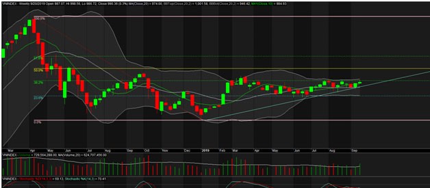Ở khung thời gian này, VN-Index cuối cùng lại vẫn không qua được mức fibo 38.2% (995,36), nâng số tuần chịu thua ngưỡng này lên 27 tuần liên tiếp. Nếu nhìn lại thì có nhiều tuần (ít nhất 5) chỉ số có cơ hội bứt qua, nhưng hết lần này đến lần khác, chốt lại vẫn không, điều này chứng tỏ ngưỡng này quá mạnh. Hay nói cách khác, thị trường chưa có cú huých đủ mạnh để đưa chỉ số bứt hẳn qua. Vì vậy, VN-Index lại phải cần thêm ít nhất 1 tuần nữa để có thể chinh phục được mức này.