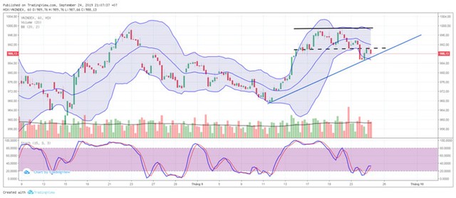 Kết phiên giao dịch ngày 24/9/2019, VN-Index chốt ở 988,13 điểm, tăng 2,38 điểm (+0,24%) với khối lượng giao dịch khớp lệnh đạt 120 triệu đơn vị, giá trị 2.673 tỷ đồng.