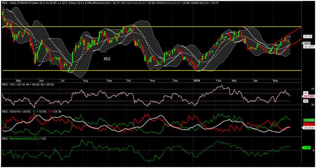 Từ quý III/2018 đến nay, REE đang giao dịch trong vùng 28-35. Hiện tại, REE đã điều chỉnh 5 phiên với thanh khoản thấp từ đỉnh gần nhất thiết lập ngày 21/5 tầm 33,75. Vùng hỗ trợ cứng của REE loanh quanh 32 gồm một số đường MA như MA20(32.35), MA50(32.25), MA200(32).