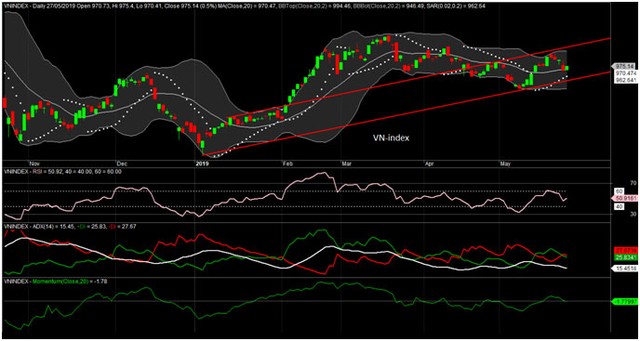 Kết phiên giao dịch ngày 27/5/2019, VN-Index chốt ở 975,14 điểm, tăng 5,11 điểm (+0,53%) với khối lượng giao dịch khớp lệnh đạt 95,9 triệu đơn vị, giá trị 2,176 tỷ đồng.