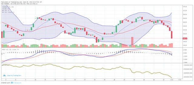 Kết phiên giao dịch ngày 27/6/2019, VN-Index chốt ở 943,11 điểm giảm mạnh 16,02 điểm (-1,67%) với khối lượng giao dịch khớp lệnh đạt 123 triệu đơn vị, giá trị 2.627 tỷ đồng.