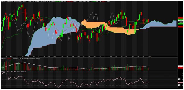Với hệ thống Ichimoku, VN-Index đang biến động giữa 2 đường Tenkan và Kijun, bộ 3 đường này đang khá sát đám mây hiện tại. Giá đang có xu hướng đi vào khu vực mây này (tầm 978-968), mặc dù độ dày chỉ là 10 điểm, tương đối mong manh.