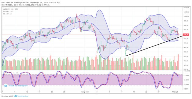 Ở khung thời gian này, VN-Index dường như đang muốn dò đáy kênh (tầm 976-977 điểm). Với áp lực bán như thanh Bar cuối cùng đã thể hiện ở phiên 3/9, thì khả năng xuyên thủng kênh có lẽ không hề nhỏ. Hiện tại, chỉ số cũng đóng cửa nhỏ thua cả MA20, thiết lập 1 giao cắt khá tệ. Hơn nữa, chỉ báo Stochastic cũng đang cắm đầu về ngưỡng quá bán cũng là những tín hiệu không mấy khả quan. Rất có thể, trong 1 vài giờ tới, VN-Index sẽ tiếp tục chịu áp lực điều chỉnh.