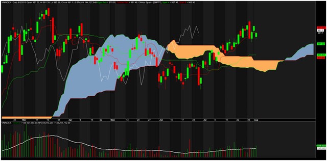 Với hệ thống Ichimoku. Mặc dù giá đã nằm dưới đường Tenkan nhưng khoảng cách là cực gần, các chỉ báo khác trong hệ thống cũng không có gì phải lo lắng. Đáng chú ý có đường Kijun, tuy đã vượt qua mây nhưng Kijun đang đi ngang, chưa bám theo đường Tenkan, chứng tỏ nhịp tăng đang chững lại, có khả năng VN-Index sẽ đi ngang, lình xình tích lũy trong một vài phiên tới trước khi phát ra những tín hiệu rõ ràng hơn.