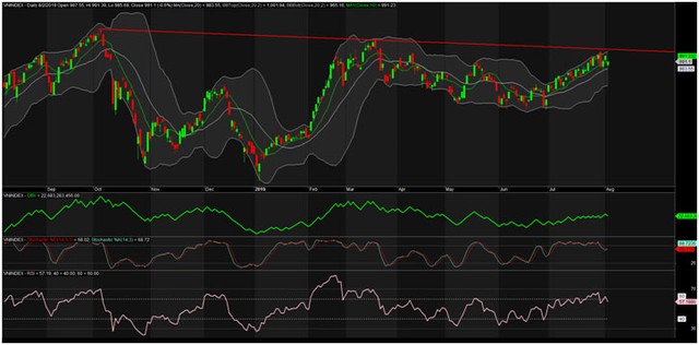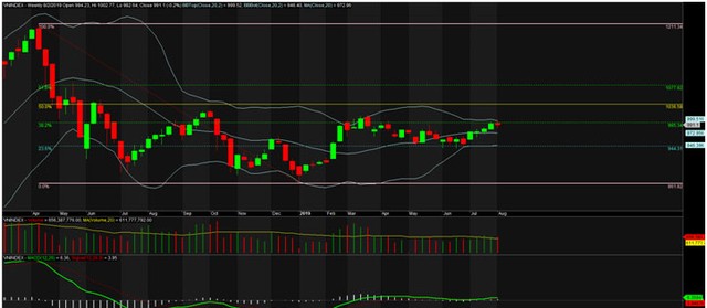 Ở khung thời gian này, dải BB đang thắt lại, giá trong tuần có test BB top, nhưng thất bại. Ngoài ra, cần nhắc lại là VN-Index vẫn đang dao động trong khoảng fibo 23,6% (944,31) và fibo 38,2% (995,34). Hiện tại, chỉ số vẫn chưa thoát ra khỏi vùng dao động này (944,31 - 995,34). Ngưỡng cản 995,34 rất mạnh khi đã rất nhiều lần VN-Index cố gắng vượt qua nhưng đều thất bại.