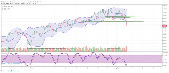 Kết phiên giao dịch ngày 5/8/2019, VN-Index chốt ở 973,15 điểm, giảm 17,95 điểm (-1,81%) với khối lượng giao dịch khớp lệnh đạt 148 triệu đơn vị, giá trị 3.370 tỷ đồng.