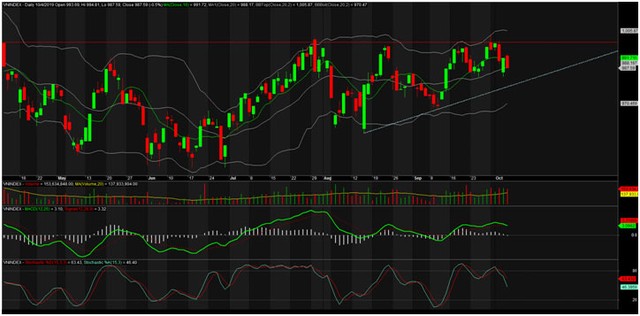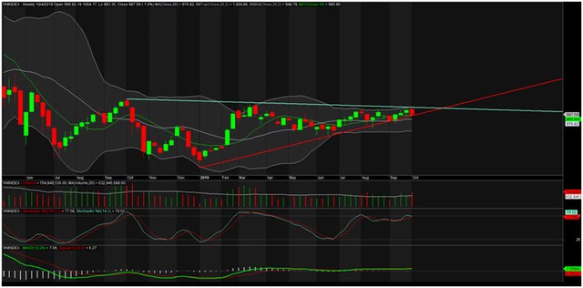 Thị trường có lẽ đang muốn test lại đường Trendline nối 2 đáy thấp nhất của tháng 8 và tháng 9 vừa qua ở quanh 977 - 978 điểm đồng thời cũng là khu vực của MA20 tuần án ngữ. Về cơ bản thì không khó nhận ra đây là 1 trend lên (yếu) với đáy sau cao hơn đáy trước, nhưng đỉnh tương ứng thì không cao hơn một cách thuyết phục.