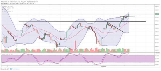Kết phiên giao dịch ngày 5/7/2019, VN-Index chốt ở 975,34 điểm, tăng 2,3 điểm (+0,24%) với khối lượng giao dịch khớp lệnh đạt 117 triệu đơn vị, giá trị 2.712 tỷ đồng.