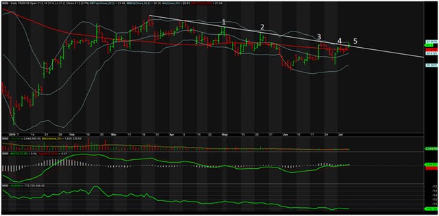 Quan sát sự vận động của MBB trên đồ thị thì thấy, đây là lần test thứ 5 MBB mới vượt qua kênh giá xuống (như trên đồ thị). Càng nhiều khó khăn, thành quả thu được càng xứng đáng. Các chỉ báo đáng chú ý của MBB có MACD đang trên đường tín hiệu và phiên break cuối tuần có khối lượng khớp lệnh vượt hẳn trung bình 20 phiên.