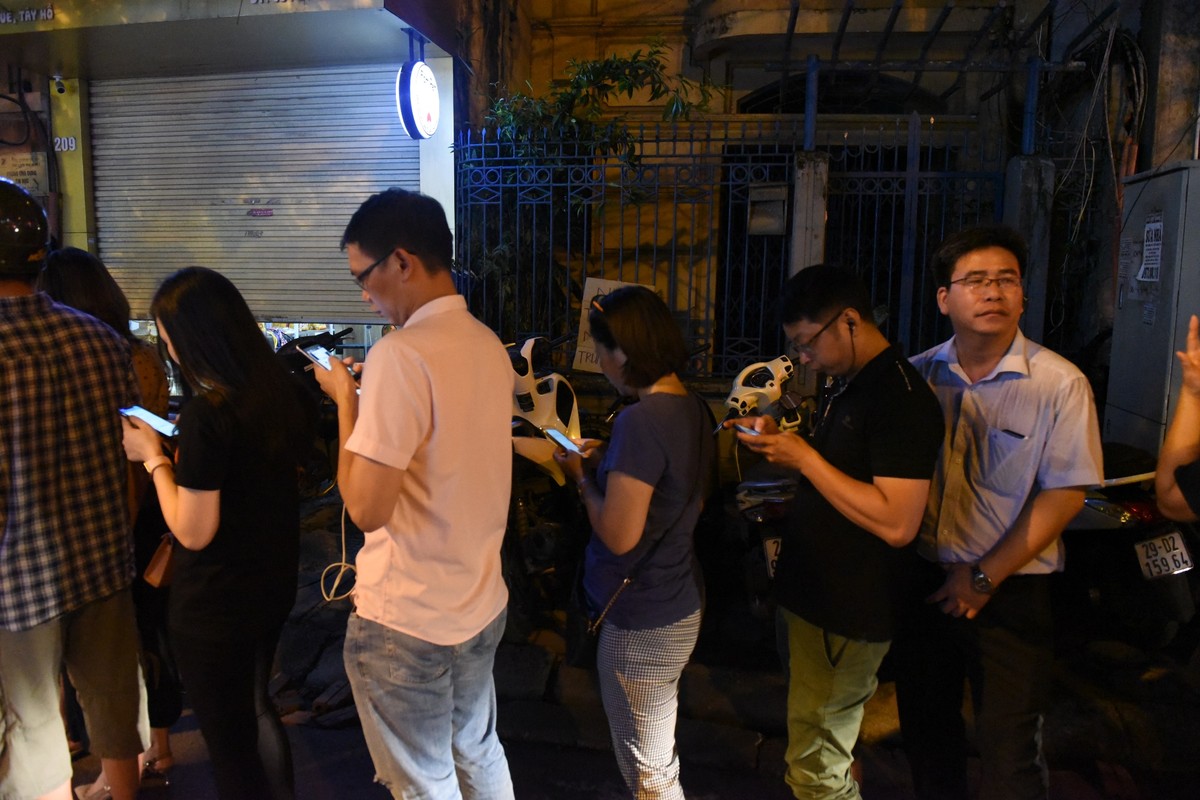 Những người chờ đợi giết thời gian bằng cách sử dụng iện thoại. 8h tối, anh Giang nhà ở Hà Đông cho biết, tiện đường qua nên đã xếp hàng mà chưa kịp ăn uống.
