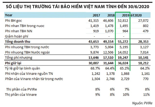 Tuy vậy, có một thực tế là thị phần của các nhà tái bảo hiểm nội địa vẫn rất khiêm tốn, chỉ khoảng 17% tính đến cuối năm 2019. Trong đó, Tổng công ty Tái bảo hiểm quốc gia Việt Nam - Vinare (mã chứng khoán VNR) chiếm khoảng 10%, còn PVIRe là khoảng 7%.