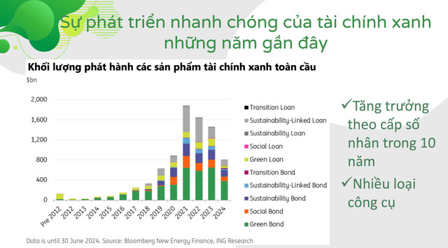 “Dư nợ tín dụng xanh, cụ thể, tổng giá trị các sản phẩm tài chính xanh (bao gồm trái phiếu xanh, khoản vay xanh, và khoản vay liên kết bền vững) vượt 20 tỷ USD tính đến năm 2023. Trong đó, trái phiếu xanh và khoản vay xanh chiếm phần lớn dư nợ tín dụng xanh”, ông Hùng cho biết.