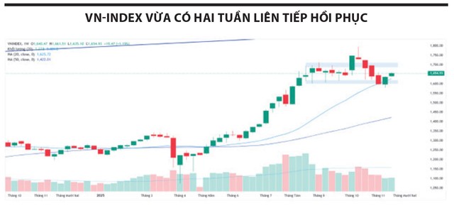 Đến cuối tuần, sự hỗ trợ trở lại của nhóm vốn hóa lớn giúp chỉ số bật hồi, qua đó ghi nhận tuần tăng thứ hai liên tiếp kể từ vùng đáy 1.580 điểm. Kết tuần, VN-Index tăng hơn 19 điểm (tăng 1,19%) và đóng cửa sát 1.655 điểm.
