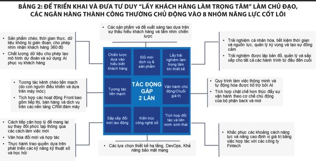 Nghiên cứu của KPMG cho thấy, các ngân hàng đầu tư tương đối hoặc đáng kể vào tất cả 8 năng lực cốt lõi nên thường đạt được hiệu quả hơn gấp 2 lần so với bình quân trong ngành và đạt được hiệu quả “Trải nghiệm khách hàng” và hiệu quả đầu tư hơn kỳ vọng đặt ra.
