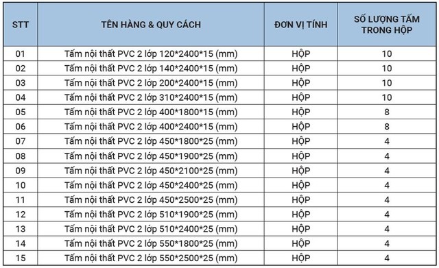Kích thước cơ bản của tấm nội thất PVC – 2 lớp của Tập đoàn Nhựa Đông Á được dựa theo tiêu chuẩn phổ thông, với độ rộng đa dạng từ 120 mm cho tới 550 mm và độ dày của ván nhựa từ 15 mm đến 25 mm.