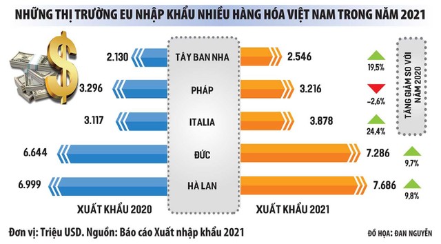 Theo Tổng cục Hải quan, năm 2021, kim ngạch thương mại hàng hóa hai chiều Việt Nam - EU đạt hơn 57 tỷ USD, tăng 14,5% so với năm 2020. Trong đó, xuất khẩu đạt 40,12 tỷ USD, tăng 14,2%; nhập khẩu đạt 16,89 tỷ USD, tăng 15,3%. Năm 2021, Việt Nam xuất siêu sang thị trường các nước EU khoảng 23,23 tỷ USD.