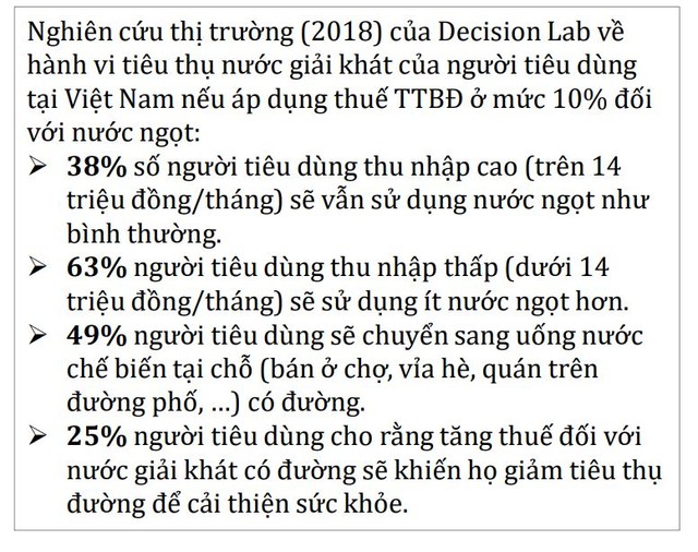 Trong khi đó, người tiêu dùng thu nhập thấp sẽ do dự hoặc giảm chi tiêu, tiêu thụ nước giải khát nếu giá thành sản phẩm tăng thêm 10%. Phần lớn nhóm người tiêu dùng có thu nhập thấp tập trung ở khu vực nông thôn, nơi có tỷ lệ thừa cân béo phì thấp. Sự sẵn có của các loại nước uống đường phố như trà sữa, nước trái cây pha sẵn, trà sữa… cũng khiến người tiêu dùng dễ dàng tiếp cận các loại nước giải khát có đường không bị ảnh hưởng bởi thuế TTĐB, nhưng lại tiềm ẩn các nguy cơ về vệ sinh an toàn thực phẩm.