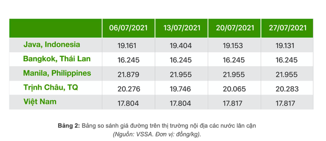 Tuy vậy, có thể thấy giá đường nội địa của Việt Nam vẫn đang duy trì ở mức thấp hơn 20% so với các nước ASEAN và Trung Quốc. Cụ thể, theo báo cáo của Vietnambiz, giá đường trong nước ở thời điểm 27/7 đạt ~17.800 đồng/kg, nhưng tại Trung Quốc là 20.283 đồng/kg, Philippines là 21.955 đồng/kg, tại Indonesia là 19.130 đồng/cp, Thái Lan là 16.245 đồng/kg.