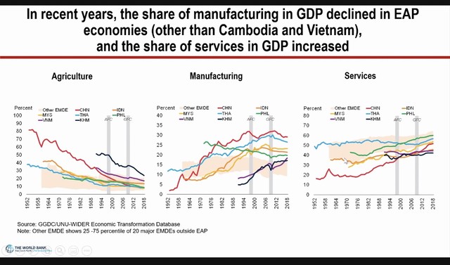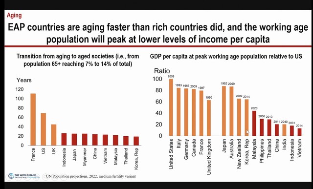 Theo Chuyên gia kinh tế trưởng phụ trách khu vực Đông Á và Thái Bình Dương của Ngân hàng Thế giới, ông Aaditya Mattoo: “Vấn đề toàn cầu hóa bị đảo ngược, dân số già hóa và biến đổi khí hậu đang phủ bóng đen lên viễn cảnh tăng trưởng của một khu vực từng phát triển nhanh nhờ thương mại nhưng đang già hóa nhanh chóng. Tuy nhiên, xúc tiến thương mại, giải quyết những thách thức về cơ cấu dân số, và nâng cao khả năng chống chịu khí hậu sẽ vực dậy tăng trưởng.”