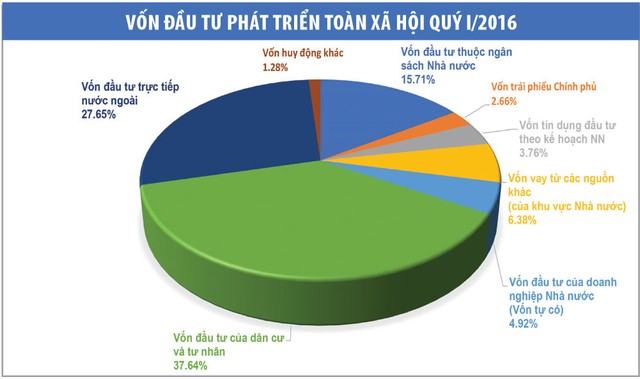 Bên cạnh đó, bức tranh đầu tư và tăng trưởng quý I vẫn chủ yếu dựa vào vốn, trong khi đóng góp vốn đang giảm dần từ 60% xuống 55%, vốn vay ưu đãi chiếm tỷ trọng thấp, vốn Nhà nước chỉ chiếm 34 - 35%, còn lại là các thành phần vốn tư nhân và FDI. Nếu thiếu hụt vốn đầu tư từ nhà nước, giải pháp sẽ là tăng huy động vốn từ khu vực ngoài Nhà nước và từ toàn xã hội theo hướng xã hội hóa.