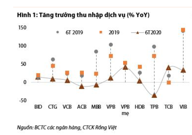 Một nghiên cứu của Công ty Chứng khoán Rồng Việt (VDSC) vừa công bố cho biết, trong nửa đầu năm 2020, tăng trưởng thu nhập dịch vụ tại các ngân hàng niêm yết yếu đi đáng kể, khi chỉ đạt 9,9% so với cuối năm (thấp hơn nhiều so với 42,1% trong 6 tháng năm 2019), với tỷ trọng đóng góp vào tổng thu nhập hoạt động không đổi so với cùng kỳ, ở mức 10,6%.