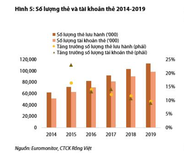 Tổng số lượng thẻ đang lưu hành và số lượng tài khoản thẻ tại các ngân hàng vẫn có xu hướng tăng trưởng trong các năm trở lại đây dù tốc độ tăng trưởng đang chậm lại (Hình 5).