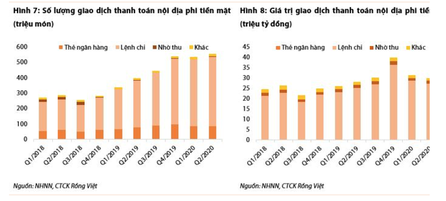 Bên cạnh đó, xu hướng khuyến khích thanh toán không dùng tiền mặt cũng tạo ra xu hướng tăng trưởng giao dịch thanh toán nội địa qua các kênh thẻ, chuyển khoản và nhờ thu cả về số lượng và giá trị giao dịch (Hình 7, 8). Đây sẽ là động lực tăng trưởng cho phí thanh toán và phí thẻ vẫn, vốn là hai nguồn đóng góp truyền thống vào phí dịch vụ của các ngân hàng.