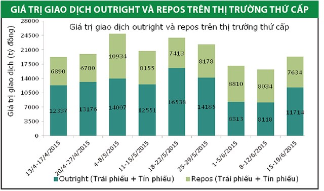 Thị trường trái phiếu thứ cấp trong tuần từ 15 - 19/6 ghi nhận khối lượng giao dịch đạt 19.348 tỷ đồng, tương đương giá trị giao dịch trung bình 3.870 tỷ đồng/ngày, tăng 19,8% so với tuần trước đó. Giao dịch thông thường (outright) chiếm tỷ trọng 61%, giá trị giao dịch đạt 11,714 tỷ đồng. Giao dịch mua bán lại (repos) đạt 7.634 tỷ đồng, chiếm 39% tổng giá trị giao dịch.