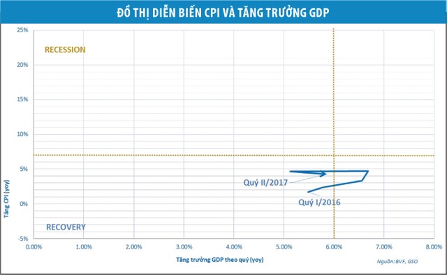 Mặc dù tăng trưởng GDP 6 tháng đầu năm 2017 so với cùng kỳ năm trước chỉ đạt 5,73%, thấp hơn khá nhiều so với kế hoạch đề ra của Chính phủ, nhưng các yếu tố vĩ mô đều ở trạng thái ổn định, lạm phát đang được duy trì ở mức vừa phải (dưới 5%), các cân đối vĩ mô khác như thâm hụt ngân sách, cán cân xuất nhập khẩu, cán cân thanh toán đều nằm trong trạng thái có thể kiểm soát.