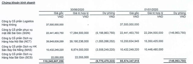 Tính tới 30/06/2020, doanh nghiệp đang sở hữu danh mục đầu tư 100,4 tỷ đồng, đã dự phòng gần 9,8 tỷ đồng. Trong đó, sở hữu CTCP Phục vụ mặt đất Sài Gòn (SGN) là 17,3 tỷ đồng; CTCP Dịch vụ Hàng hóa Nội Bài (NCT) là 39,2 tỷ đồng; CTCP Dịch vụ hàng không Sân Bay Đà Nẵng (MAS) là 6,9 tỷ đồng …