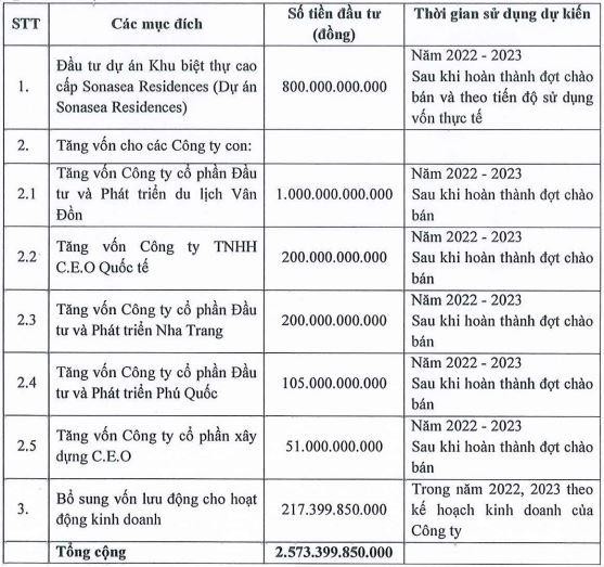 Số tiền thu được từ việc phát hành thêm cổ phiếu đạt xấp xỉ 2.573,4 tỷ đồng, Tập đoàn C.E.O sẽ sử dụng cho các mục đích theo thứ tự ưu tiên từ 1 đến 7.