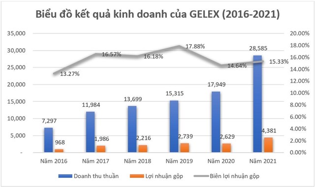 Đối với lĩnh vực kinh doanh năng lượng (điện, nước), năm 2021, GELEX ghi nhận doanh thu 1.134 tỷ đồng, tăng trưởng 26,3% so với năm trước, chiếm 4% doanh thu thuần hợp nhất của GELEX.