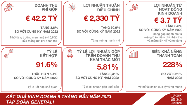 Tỷ lệ kết hợp được cải thiện ở mức 91,6% (thấp hơn 5,4% so với cùng kỳ năm 2022). Tỷ lệ lợi nhuận hợp đồng khai thác mới đạt 5,81% (tăng 0,31% so với cùng kỳ năm 2022). Lợi nhuận thuần tăng đáng kể lên mức 2,333 tỷ Euro (tăng 60,9%).