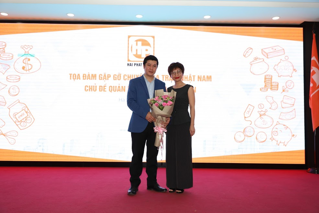 Chuyên gia tài chính Trần Nhật Nam chụp ảnh lưu niệm cùng bà Trần Hoài Anh - Phó Tổng giám đốc