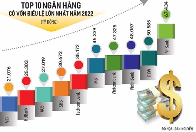 Hiện VPBank đang dẫn đầu hệ thống về vốn điều lệ với hơn 67.000 tỷ đồng. Các ngân hàng có vốn điều lệ cao tiếp theo lần lượt là BIDV 50.585 tỷ đồng, VietinBank 48.057 tỷ đồng, Vietcombank 47.325 tỷ đồng, MB 45.339 tỷ đồng, Techcombank, SHB (vốn điều lệ trên 30.000 tỷ đồng) và ACB, HDBank, VIB (vốn điều lệ trên 20.000 tỷ đồng)…