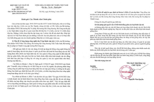 Theo đó, tại công văn số 20/HHVT-TV/KN ngày 6/3/2019 do ông Nguyễn Văn Quyền - Chủ tịch Hiệp hội Vận tải ô tô Việt Nam ký gửi đến "Các thành viên Chính phủ" đóng góp 5 ý kiến liên quan đến góp ý dự thảo Nghị định thay thế Nghị định 86/2014/NĐ-CP về kinh doanh vận tải hành khách bằng xe ô tô.