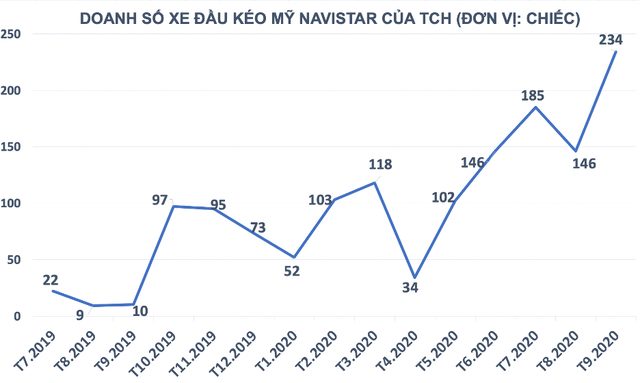 Ở mảng xe thương mại, doanh số xe đầu kéo Navsitar (Mỹ) của TCH cũng đang có đà tăng trưởng vững chắc và vượt trội. Cụ thể, tháng 9 vừa qua, doanh số xe đạt 234 chiếc, tăng mạnh so với các tháng trước.
