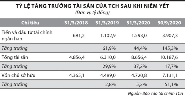 Kể từ 31/3/2018, TCH duy trì được tốc độ tăng trưởng tài sản 28,3%/năm. Tiềm lực tài chính là lợi thế để Công ty triển khai các dự án bất động sản, tiếp tục tăng trưởng mạnh trong những năm tới.