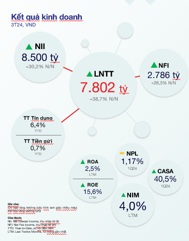 Tăng trưởng tín dụng của Ngân hàng tiếp tục cao hơn thị trường, biên lãi thuần (NIM) cải thiện, và số dư CASA tiếp tục tăng khoảng 2% từ đầu năm, trên mức nền cao tại cuối 2023.