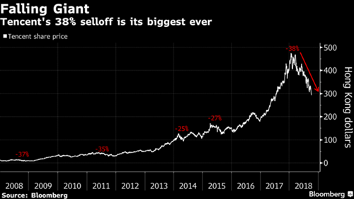 Cổ phiếu Tencent đã mất 38% kể từ khi đạt đỉnh hồi tháng 1 năm nay. Đây là mức giảm mạnh nhất của mã này từ khi niêm yết năm 2004 trên sàn Hong Kong. Hôm nay, mã này giảm phiên thứ 8 liên tiếp, với 1,74%, xuống thấp nhất kể từ tháng 7/2017.