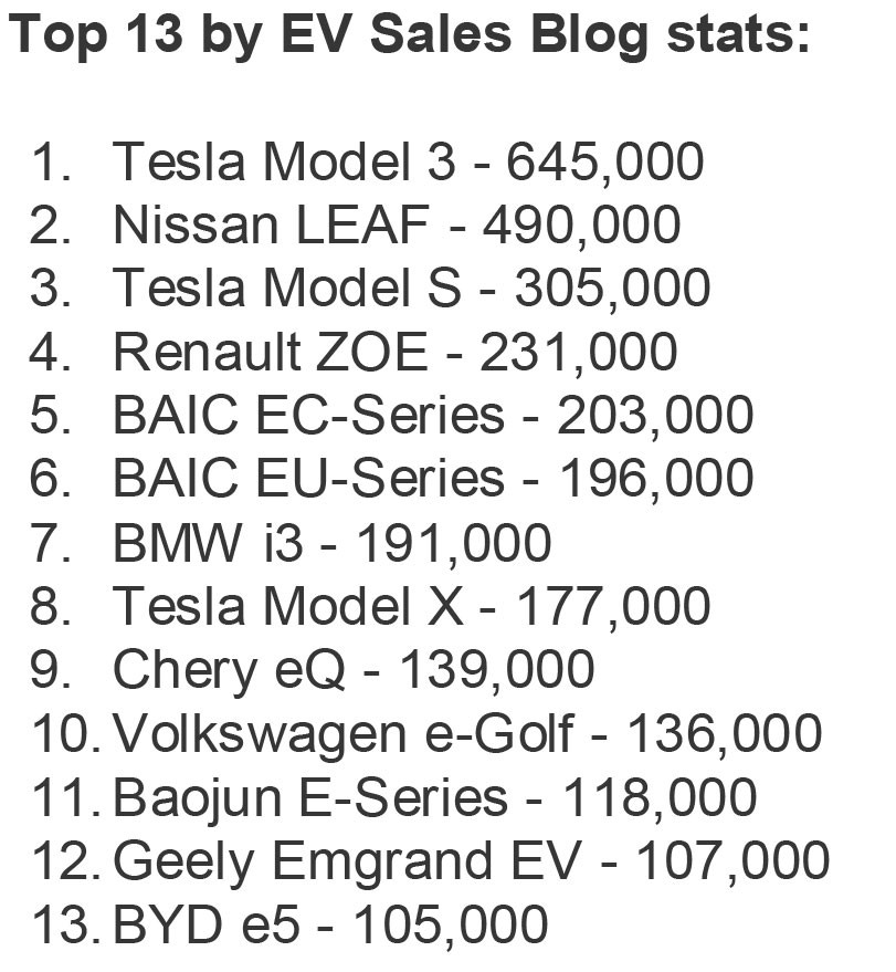 Theo bộ dữ liệu của EV Sales Blog, cho thấy bảng xếp hạng 13 mẫu xe ô tô điện bán chạy nhất mọi thời đại (trừ các loại xe Hybrid cắm sạc) chỉ có 5 mẫu là có doanh số vượt 200.000 chiếc.