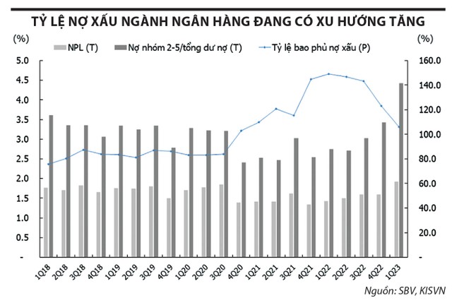 Thực tế cho thấy, nợ xấu ngành ngân hàng có xu hướng tăng trong quý đầu năm 2023, do ảnh hưởng bởi thị trường bất động sản và trái phiếu doanh nghiệp. Nợ xấu (nợ nhóm 3, 4, 5) của các nhà băng tính đến cuối quý I/2023 đều tăng so với cuối năm 2022.