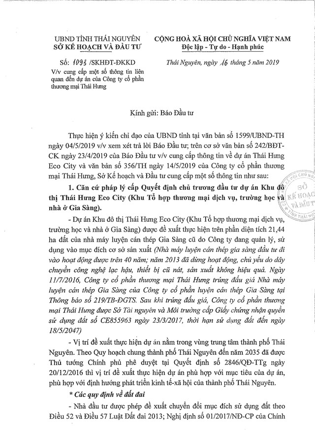 Từ yêu cầu này, Sở Kế hoạch và Đầu tư Thái Nguyên cũng đã có Công văn số 1093/SKHĐT-ĐKKD ngày 16/5/2019 gửi Báo Đầu tư, cho biết các thông tin cơ bản của dự án Khu đô thị Thái Hưng Eco City. Theo đó, dự án này đề xuất thực hiện trên phần diện tích 21,44 ha đất của Nhà máy Luyện cán thép Gia Sàng cũ do Công ty Thái Hưng đang quản lý, sử dụng vào mục đích cơ sở sản xuất.