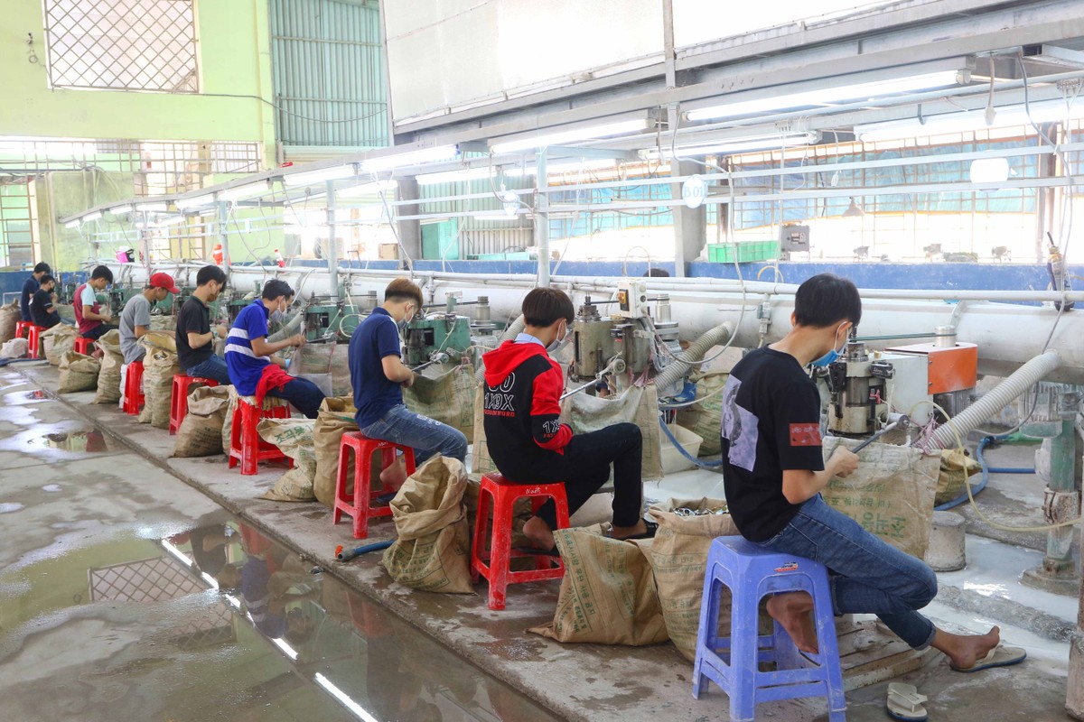Công nhân thực hiện quy trình đục vỏ để chọn ra những chiếc nút đẹp nhất.